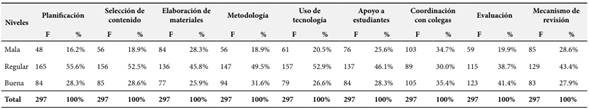 En la Tabla 3 se destaca que la planificación obtuvo un 16.2% de estudiantes, quienes perciben que el nivel es malo, mientras que el 55.6% perciben que el nivel es regular y el 29.3% indican que el nivel es bueno, en cuanto a la selección de contenido según los estudiantes encuestados, se tiene que el 18.9% perciben que el nivel es malo, mientras que el 52.5% perciben que el nivel es regular y el 28.6% indican que el nivel es bueno, asimismo, en la elaboración de materiales, se tiene que el 28.3% perciben que el nivel es malo, mientras que el 45.8% perciben que el nivel es regular y el 25.9% indican que el nivel es bueno.