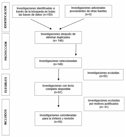 De los 150 artículos inicialmente identificados, se excluyeron 4 que resultaron ser duplicados, dejando un total de 146 investigaciones para la siguiente etapa. De estos, solo 91 artículos contaban con el texto completo disponible y cumplían con los criterios de inclusión, como la relevancia de la información, estar publicados en los últimos 10 años, y proceder de fuentes confiables como Scopus, Google Scholar, Scielo y Dialnet. Finalmente, se seleccionaron 50 artículos que cumplían con todos los criterios establecidos para el análisis de la sistematización. tal como se evidencia en la Figura 1.
