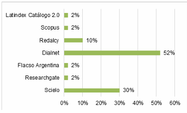 En relación con la Figura 3, que muestra la agrupación de artículos publicados sobre el trabajo colaborativo según su base de datos, se observa que la fuente más recurrente fue Dialnet, con un 52%, seguida por Scielo, con un 30%. Redalyc aportó un 10%, mientras que Latindex Catálogo 2.0, Scopus, Flacso Argentina y ResearchGate representaron cada una un 2%. Estas fuentes, reconocidas por su confiabilidad, agrupan trabajos y publicaciones científicas relacionadas con el trabajo colaborativo.