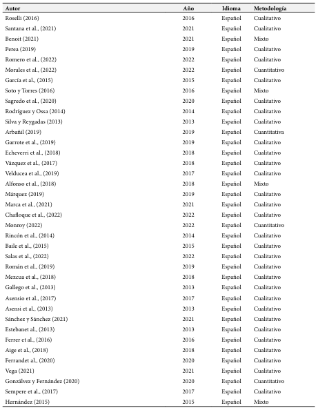 Finalmente, se seleccionaron 50 artículos para la sistematización, considerando aquellos publicados entre 2013 y 2023 en español e inglés, y que compartieran palabras clave relevantes con el presente estudio. Estos artículos fueron organizados conforme a su autoría, año de publicación, idioma, base de datos, revista, y su contribución al tema, tal como se presenta en la Tabla 1.