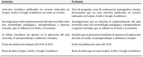 Se llevó a cabo un estudio, de enfoque cualitativo y alcance descriptivo, bajo la metodología de una revisión sistemática de artículos científicos publicados en revistas indexadas. Asimismo, se aplicaron los aspectos el método PRISMA. Se tuvo como punto de partida la pregunta base: ¿cuáles son los aportes del aula invertida en el autoaprendizaje de los estudiantes universitarios en entornos virtuales? Se utilizaron como motores y ecuaciones de búsqueda las bases de datos Scopus (“Flipped classroom” AND “Self-learning” AND “Virtual environment”), Scielo y Google Académico (“Aula invertida” AND “Autoaprendizaje” AND “Entorno virtual”). Los criterios de inclusión y exclusión se encuentran establecidos en la Tabla 1.