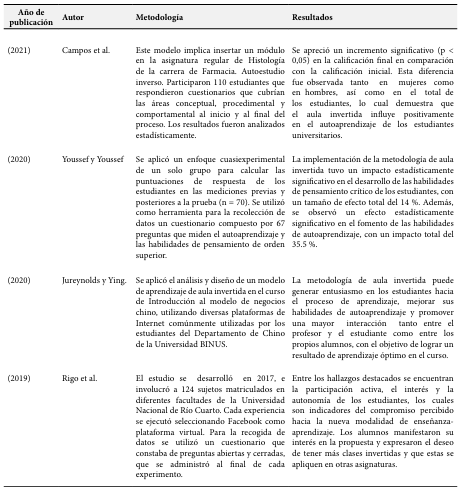 En los entornos virtuales, el aula invertida mejora la conexión existente entre la interactividad, la motivación, el trabajo colaborativo y la evaluación formativa, así como el autoaprendizaje, lo que la convierte en muy atractiva frente al aula tradicional (Molina et al., 2021; Williner, 2021). En un ámbito profesional como la cirugía médica, el aula invertida se aprecia como una opción viable para sustituir el modelo tradicional del aula invertida, sin afectar la capacidad de los estudiantes para llevar a cabo un aprendizaje autodirigido (Domínguez et al., 2021). En este contexto se enmarcan los elementos aportados por Gonzales et al., (2023) quienes sostienen que los educadores y diseñadores de programas formativos han identificado al aula invertida como una estrategia efectiva para maximizar su impacto en el autoaprendizaje de los estudiantes universitarios en entornos virtuales.