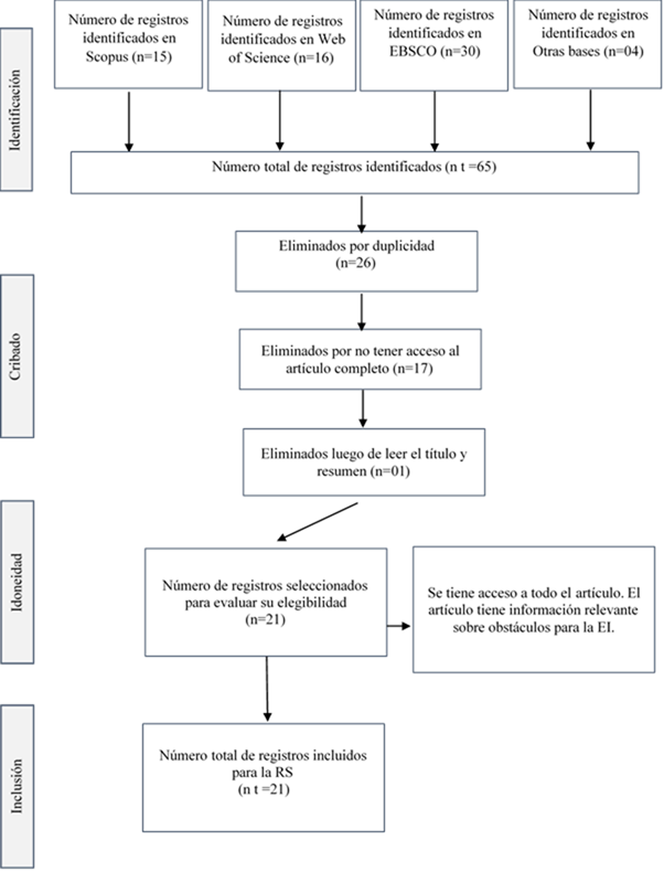 A través del protocolo de búsqueda, se identificaron un total de 65 artículos: 15 en la base de datos de Scopus, 16 en Web of Science, 30 en Ebsco y 4 en otras bases de datos. Posteriormente, se realizó un proceso de cribado en el que se revisaron minuciosamente los artículos seleccionados, enfocados especialmente en sus resultados, conclusiones y recomendaciones quedando para el análisis 21 fuentes identificadas. Este análisis se llevó a cabo mediante la elaboración de fichas y cuadros comparativos que facilitaron la sistematización de la información relevante. El proceso de cribado y selección de los registros identificados se ilustra en la Figura 1, que muestra la cantidad de artículos inicialmente identificados, los duplicados eliminados y los finalmente seleccionados para su análisis.