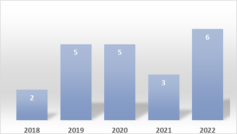 En la Figura 2, se observa la distribución de los artículos por año de publicación. En 2018, se publicaron 2 artículos, representando el 10% del total. En 2019 y 2020, se publicaron 5 artículos cada año, equivalentes al 24% del total en ambos años. En 2021, se publicaron 3 artículos, que corresponden al 14% del total, y en 2022, se publicaron 6 artículos, lo que constituye el 28% del total.