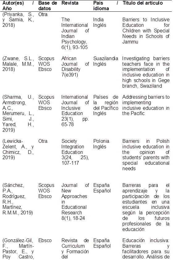 Para la selección de los artículos, se establecieron criterios de inclusión y exclusión. Los criterios de inclusión fueron: (1) que el artículo haya sido publicado en los últimos cinco años y (2) que aporte información relevante sobre los obstáculos para la educación inclusiva. Los criterios de exclusión incluyeron: (1) artículos cuyo año de publicación no estuviera dentro del rango establecido y (2) artículos duplicados, es decir, aquellos que aparecieran en más de una de las bases de datos consideradas. En estos casos, se mantuvo solo uno de los artículos, excluyendo los duplicados.