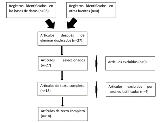 Se aplicaron criterios de inclusión específicos para esta revisión sistemática, entre los cuales se incluyeron: (a) que la investigación formativa fuera el tema principal del estudio, (b) artículos publicados entre los años 2018 y 2022, y (c) artículos escritos en inglés, español y/o portugués. Los criterios de exclusión consideraron artículos no relacionados con el tema, publicaciones fuera del periodo establecido, artículos duplicados, y documentos como libros, monografías y tesis. Tras aplicar estos criterios, se seleccionaron 14 artículos, utilizando el diagrama de flujo PRISMA para ilustrar el proceso de selección como se evidencia en la Figura 1.