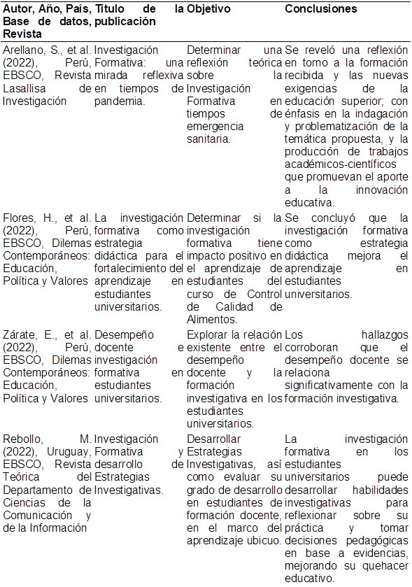 Se observa un consenso entre los autores Rebollo (2022) y Símon et al., (2021) quienes destacan que la investigación formativa es un proceso que apoya la función docente y se orienta hacia métodos adecuados para alcanzar un aprendizaje significativo. Ambos autores coinciden en que la investigación formativa es un método pedagógico fundamental en el proceso de enseñanza-aprendizaje, fomentando en los estudiantes universitarios un enfoque reflexivo, crítico y constructivista. Este enfoque busca lograr una educación científica a través de ejercicios investigativos que incorporan lógica y metodología de investigación.