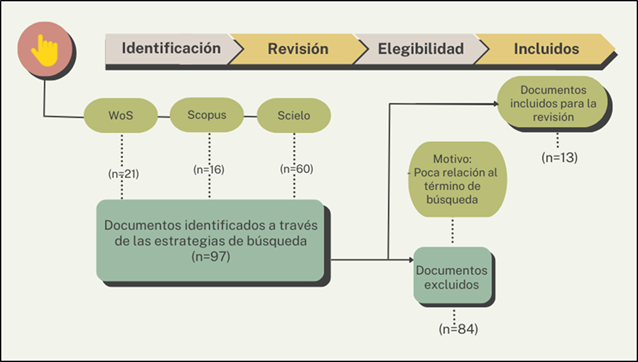 En cuanto a las fuentes de información, se analizaron 13 documentos extraídos de las bases de datos Web of Science, Scopus y SciELO. Los criterios de inclusión consideraron artículos de revisión y originales en inglés y español, publicados entre 2020 y 2023, en los ámbitos educativo, psicológico y de salud. Se excluyeron documentos del ámbito universitario, artículos duplicados, y fuentes como libros, monografías, artículos de conferencias, ensayos y tesis como se evidencia en la Figura 1.
