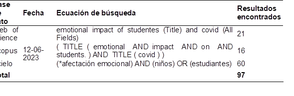 Este estudio se enmarcó dentro de la investigación básica, enfocándose en la adopción del conocimiento existente para analizar y contrastar diferentes investigaciones sobre las medidas para superar la afectación emocional de los estudiantes en contextos educativos postpandemia. El diseño se planteó de forma no experimental, empleando fuentes bibliográficas adecuadas para una revisión sistemática. Para analizar y sintetizar los principales hallazgos sobre los factores que afectan la salud emocional de los estudiantes y su núcleo familiar durante el retorno a las clases presenciales, y las acciones para mejorar dicha salud emocional, se adoptó parcialmente la estructura de la declaración PRISMA, según lo propuesto por Page et al., (2021). Esta estructura se centró en cuatro aspectos esenciales: identificación, selección, elegibilidad e inclusión. Las estrategias de búsqueda incluyeron el uso de operadores booleanos y filtros, arrojando los resultados preliminares que se exponen en la Tabla 1.