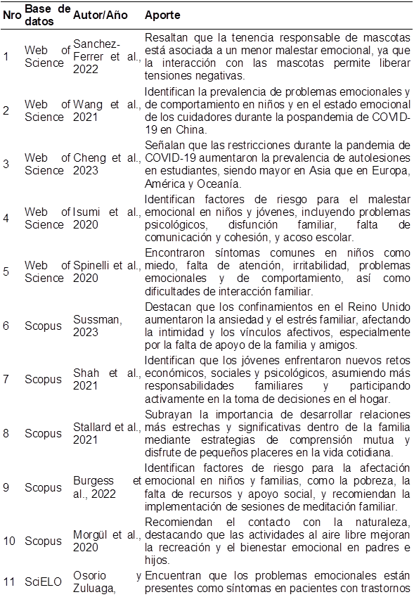 La Tabla 2 presenta una síntesis de los documentos seleccionados para esta revisión sistemática. Los estudios incluidos abordan diversas perspectivas sobre la afectación emocional de los estudiantes y sus familias en contextos educativos postpandemia, así como las estrategias de intervención sugeridas para mitigar estos impactos. A continuación, se detallan los aportes clave de cada documento, organizados según la base de datos de origen, el autor y el año de publicación.