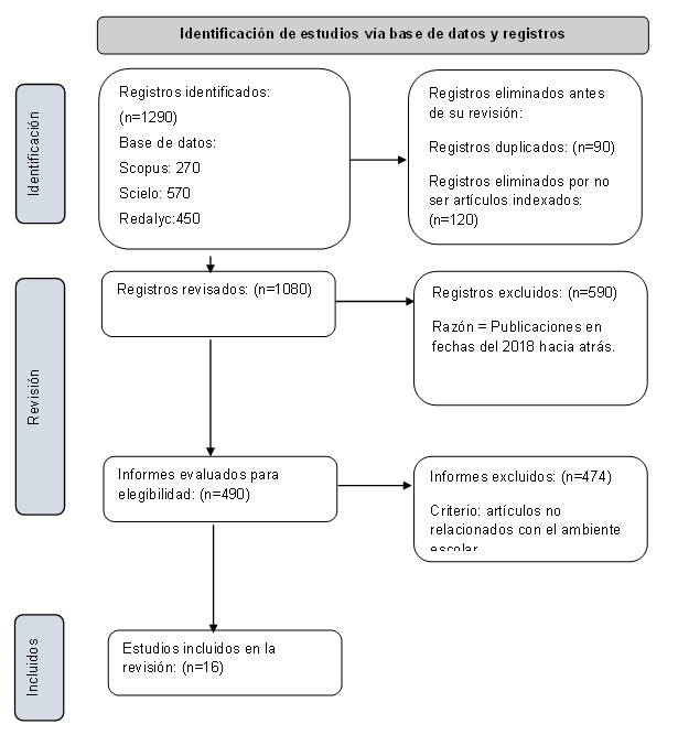 Se realizó una revisión sistemática bajo las directrices de la declaración PRISMA, lo que permitió una búsqueda exhaustiva y sistemática de la literatura académica relevante, una evaluación crítica de los estudios seleccionados y una síntesis rigurosa de la evidencia disponible (Alexander, 2020). La búsqueda de artículos se llevó a cabo en tres motores de búsqueda reconocidos: Scopus, Scielo y Dialnet, cubriendo el periodo entre enero de 2019 y julio de 2023. En la Tabla 1 se presentan las ecuaciones de búsqueda utilizadas en cada motor, junto con los operadores booleanos que se emplearon para optimizar los resultados.