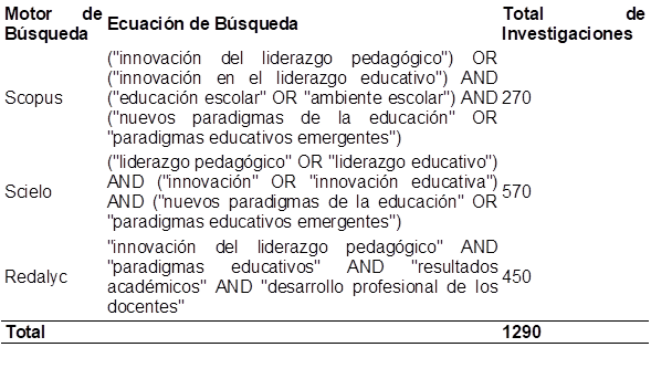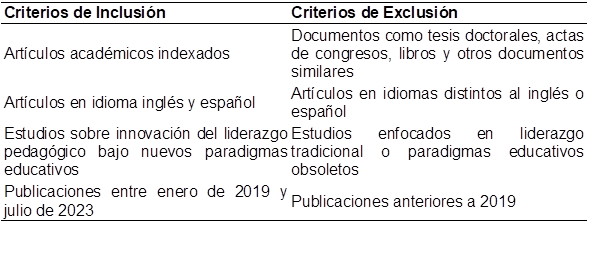 Para la selección de estudios, se formuló la siguiente pregunta de investigación: ¿Cuál es la importancia de la innovación del liderazgo pedagógico en el ámbito escolar bajo los nuevos paradigmas de la educación en términos de resultados académicos y desarrollo profesional de los docentes? Esta pregunta orientó los criterios de selección de los artículos, detallados en la Tabla 2, especificando las condiciones de inclusión y exclusión. Los estudios seleccionados debían abordar el liderazgo pedagógico en contextos escolares, la innovación en dicho liderazgo, los resultados académicos y el desarrollo profesional docente.