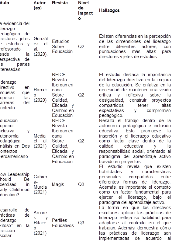 El liderazgo educativo es un tema de creciente interés y relevancia en el ámbito de la educación. Al analizar los hallazgos de estos estudios, se pueden identificar tendencias y patrones comunes que arrojan luz sobre los desafíos, las buenas prácticas y las oportunidades de mejora en el liderazgo educativo (Tabla 3).