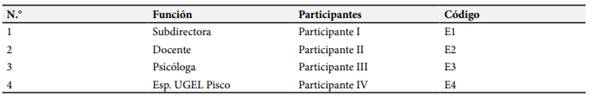 En la investigación participaron cuatro profesionales vinculados al tema, cuyas funciones y códigos se presentan en la Tabla 1.
