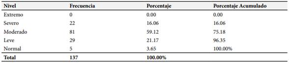 Los resultados obtenidos en relación a la variable Ansiedad, indican que el 16.06% de los encuestados perciben tener problemas de ansiedad severa, el 59.12% señalan presentar un nivel moderado de ansiedad, mientras que el 21.17% percibe algunos síntomas de ansiedad que se pueden catalogar como leves. El 3.65% indica que sus niveles de ansiedad son normales, como se evidencia en la Tabla 3.