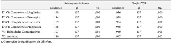 Por otro lado, la prueba de contrastación de las hipótesis se hizo con la prueba de normalidad de Kolmogorov-Smirnov debido a que la muestra sobrepasa el límite de 50 participantes. El resultado del Sig. de 0,02 menor a 0,05 indica que la distribución no es paramétrica, por tanto, las pruebas de correlación de las hipótesis se hicieron con la Rho de Spearman, como se indica en la Tabla 4.