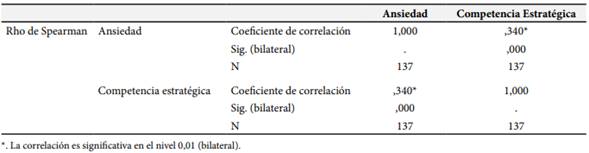 En cuanto a la dimensión Competencia Estratégica, la Tabla 6 muestra que los resultados del coeficiente de correlación Rho de Spearman es de 0,340, evidenciando una correlación positiva media. Además, ha alcanzado un p valor=0,000 haciéndola significativa con la variable Ansiedad.