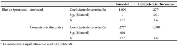 En la Tabla 7 se aprecia que la correlación Rho de Spearman ha alcanzado un resultado de 0,277 lo que indica que hay una relación positiva baja, pero significativa entre la dimensión Competencia Discursiva y la variable Ansiedad.
