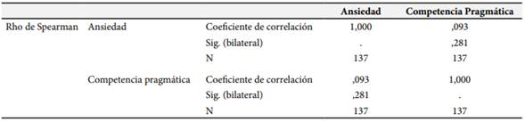 Finalmente, los resultados de la cuarta hipótesis de la correlación Rho de Spearman de 0,093, indica que hay una relación positiva muy baja entre la dimensión Competencia Pragmática y la variable Ansiedad, pero no la hace significativa. Este resultado se ve reflejado en lo expresado por Vaca (2017) quien afirma que la competencia pragmática es una entidad independiente del acto comunicativo, la cual se encarga de analizar la situación en contexto y determinar la formalidad del lenguaje. Sin duda, el aula delimita la formalidad del lenguaje utilizado, algo que no se daría en un contexto diferente donde no se debe evaluar, según el autor, el contexto social del acto comunicativo.