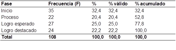 La Tabla 1 presenta los resultados del análisis sobre el nivel de logro de aprendizaje (LA) obtenido por los estudiantes, evaluado en cuatro fases: inicio, proceso, logro esperado y logro destacado. Los datos se expresaron en términos porcentuales y reflejaron tanto la distribución por cada fase como el porcentaje acumulado, evidenciando el progreso alcanzado a lo largo de las etapas del aprendizaje. Los resultados mostraron que el 32,4 % de los estudiantes se ubicó en la fase de inicio, mientras que un 20,4 % se encontraba en la fase de proceso. Por otro lado, el 25 % alcanzó el logro esperado y un 22,2 % logró destacarse. Estos datos permitieron identificar que más del 50 % de los estudiantes (52,8 %) enfrentó dificultades significativas para alcanzar los niveles de aprendizaje esperado o destacado, indicando la necesidad de reforzar estrategias pedagógicas que impulsen su desarrollo.