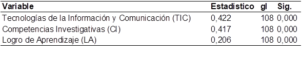 La Tabla 2 muestra los resultados de la prueba de normalidad aplicada a tres variables principales: Tecnologías de la Información y Comunicación (TIC), Competencias Investigativas (CI) y Logro de Aprendizaje (LA). Para este análisis, se utilizó la prueba de Kolmogórov-Smirnov, dado que el tamaño de la muestra superó los 50 participantes. Los resultados indicaron valores de significancia de 0,000 para las tres variables, lo que permitió concluir que ninguna de ellas seguía una distribución normal (p < 0,05). Este hallazgo justificó el uso de pruebas estadísticas no paramétricas en los análisis subsecuentes.