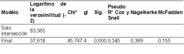 La Tabla 3 presenta los resultados de la prueba de hipótesis general, que evaluó el ajuste de los modelos utilizados en el análisis. Los indicadores reportados incluyen el logaritmo de la verosimilitud, Chi-cuadrado (Chi²), grados de libertad (gl), valor de significancia (Sig.), y tres medidas de ajuste: Cox y Snell, Nagelkerke y McFadden.