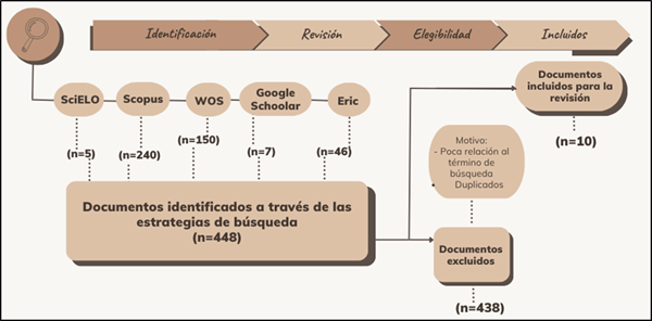 Para analizar y sintetizar los hallazgos, se adoptó parcialmente la estructura PRISMA (Page et al., 2021), considerando cuatro aspectos clave: identificación, revisión, elegibilidad e inclusión, los cuales se visualizan en la Figura 1. Los criterios de elegibilidad permitieron incluir artículos de revisión y originales en inglés y español, publicados entre 2020 y 2023, en áreas como educación, tecnología educativa, ciencias sociales y ciencias de la computación. Se excluyeron documentos duplicados, irrelevantes o fuera de estas áreas.