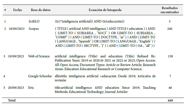 Las fuentes de información utilizadas fueron SciELO, Scopus, Web of Science, Google Scholar y ERIC, donde inicialmente se consultaron 448 documentos (Figura 1). La búsqueda se realizó utilizando el aplicativo MyLOFT y operadores booleanos para filtrar documentos con los términos de búsqueda en el título (ti:(*inteligencia artificial)) AND (ti:(educación)), limitados por campos temáticos (LIMIT-TO(SUBJAREA, "SOCI") OR LIMIT-TO(SUBJAREA, "COMP")) y por idioma (LIMIT-TO(LANGUAGE, "Spanish") OR LIMIT-TO(LANGUAGE, "English")). Además, se seleccionaron documentos de acceso abierto (LIMIT-TO(OA, "all")). Los documentos seleccionados fueron organizados en colecciones en Zotero, obteniéndose como resultado preliminar lo expuesto en la Tabla 1.