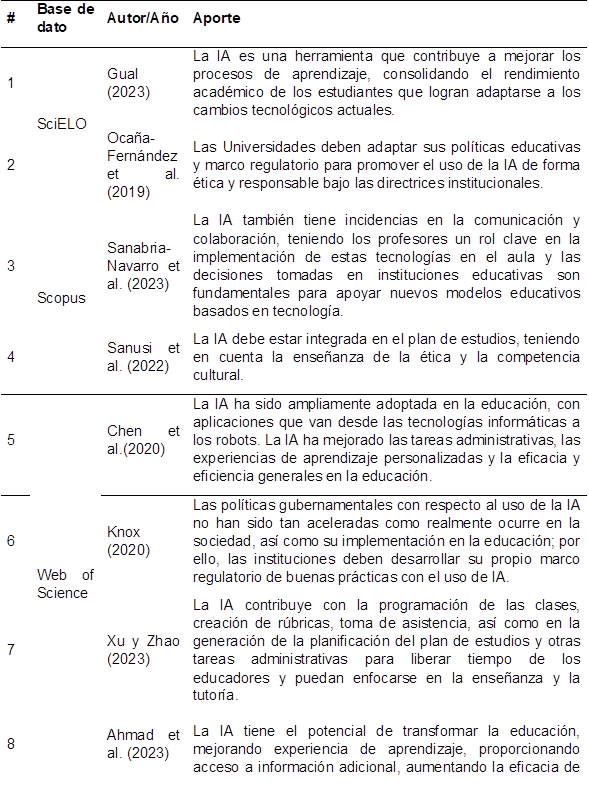 Entre los principales aportes de la IA a la educación se destaca: a) Personalización del aprendizaje: puede adecuarse al contenido y el ritmo de la enseñanza a las necesidades individuales de cada estudiante (Kamalov et al., 2023); b) Realimentación en tiempo real: ofrece retroalimentación instantánea a los estudiantes sobre su desempeño y progreso, lo que refuerza el autoaprendizaje (Ahmad et al., 2023); c) Automatización de tareas: Muchas tareas administrativas y logísticas de los profesores se pueden automatizar mediante IA, dándoles más tiempo para enseñar; estas tareas incluyen la programación de las clases, la toma de asistencia, la planificación del plan de estudios y otras tareas administrativas (Xu y Zhao, 2023); d) Evaluación inteligente: la evaluación automatizada de exámenes, ensayos y tareas puede liberar al docente de tiempo (Jimbo-Santana et al., 2023); e) Asistentes virtuales: los chatbots y tutores virtuales basados en IA brindan apoyo a los estudiantes para resolver dudas y mejorar su experiencia de aprendizaje, probablemente cobrará más importancia en el futuro (Yetişensoy y Rapoport, 2023).