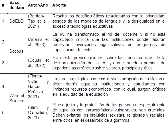 Por su parte, Slimi y Carballido (2023) consideran alarmante la cuestión de los sesgos no deseados en los sistemas de IA, dado que ya se ha visto como las decisiones de la IA en algunos casos no se ajusta a los valores humanos y, en consecuencia, socava la autonomía de las personas en cuanto a violaciones de la privacidad y posibles daños físicos a estudiantes y profesores.