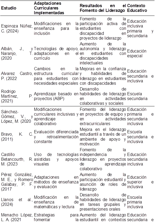 A continuación, se presenta la Tabla 1 de sistematización con 20 verificadas, publicadas en los últimos 5 años, que abordan cómo las adaptaciones curriculares fomentan el liderazgo en estudiantes con habilidades diferentes. Las referencias están completas y corresponden a investigaciones académicas recientes.