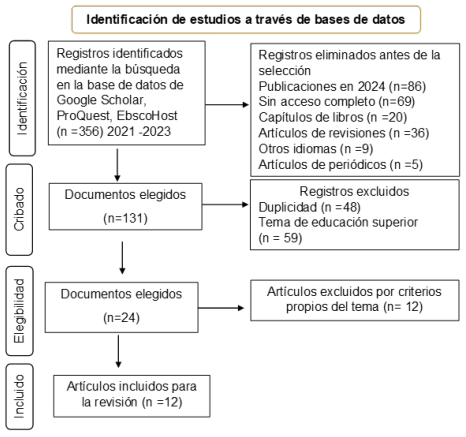 Los criterios de inclusión contemplaron artículos relacionados con dimensiones como la cooperación, comunicación asertiva, adaptación, resolución de conflictos y educación básica. Además, se seleccionaron estudios con un enfoque cuantitativo orientados a la educación básica. En total, se analizaron 12 artículos, los cuales fueron consolidados en un diagrama de flujo basado en las directrices PRISMA, como se presenta en la Figura 1. Este proceso aseguró el cumplimiento del objetivo general de la investigación, manteniendo un enfoque descriptivo.