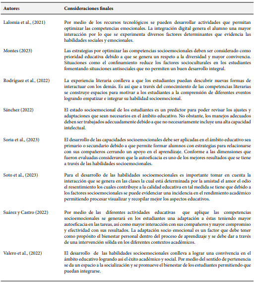 En cuanto al estudio de Aranda y Luque (2024) enfatizaron la importancia de las habilidades socioemocionales debido a que garantiza un aprendizaje completo y efectivo que permite resolver los conflictos y tomar decisiones adecuadas. De ello la sugerencia de generar políticas educativas y se oriente al desarrollo de las habilidades socioemocionales promoviéndose en las prácticas educativas. Por su parte, Valero et al., (2022) exponen que por medio del desarrollo de las habilidades socioemocional se genera estudiantes con una adecuada integración permitiendo optimizar su bienestar.