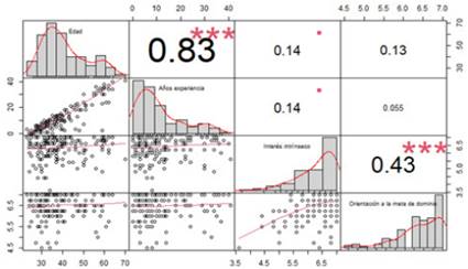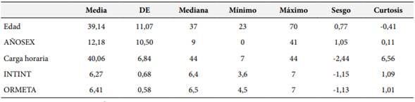 Nota. DE= Desviación estándar; AÑOSEX= Años de experiencia; ININT= Interés intrínseco; ORMETA= Orientación a la meta de dominio.