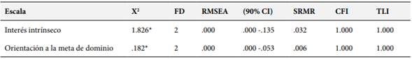 Tabla 1. Índice de ajuste del análisis factorial confirmatorio de las dimensiones Interés intrínseco y orientación a la meta de dominio.