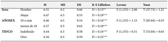 Para finalizar, se evaluaron diferencias según el tipo de contrato, para este fin, la muestra se agrupo en 2 grupos, un grupo formado por los profesores que poseen contratos indefinidos y el otro grupo conformado por los docentes con contrato a plazo fijo y con boletas de honorarios. Los profesores con contrato indefinido presentaron un promedio de 6.33(sd=0.65) y el otro grupo presentó un promedio de 6.15(sd=0.73), para evaluar si la diferencia era significativa se aplicó la prueba Robusta de Yuen, la cual no resultó significativa T (54.57) = 1.66, p= 0.10. Comparación general entre la orientación a la meta de dominio y variables sociodemográficas de sexo, años de experiencia docente y tipo de contrato, pueden ser observadas en la Tabla 3.