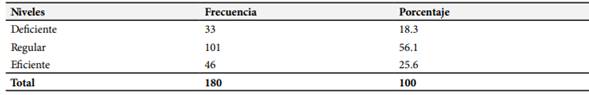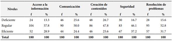 Respecto a la comunicación, el 25,6% de los estudiantes alcanzaron un nivel deficiente, el 50,0% se situaron en un nivel regular, y el 24,4% mostraron un nivel eficiente. La mayoría de los estudiantes se encuentra en el nivel regular, lo que puede indicar que, aunque la comunicación a través de las TIC es utilizada por los estudiantes, existe un margen de mejora.