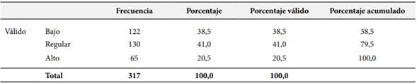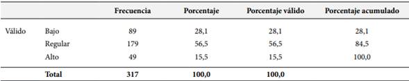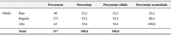 En la Tabla 1, se observa que para la variable Comprensión Lectora, 229 estudiantes alcanzaron el nivel bajo con un 72,2%, 82 estudiantes se encuentran en el nivel regular con un 25,9% y 6 estudiantes se encuentran en el nivel alto que representa un 1,9%.