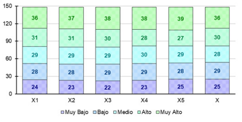 La distribución de frecuencias de la variable independiente y sus dimensiones se muestra en la Figura 2. Se observa que, para todos los casos, el nivel Muy Alto es el predominante, con valores que oscilan entre 36 (24.32% de la muestra, empate entre X y X1) y 39 (26.35% de la muestra, X5) casos.