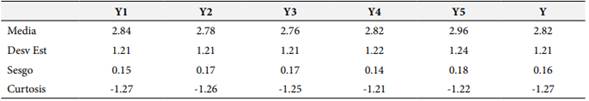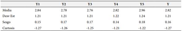 Los resultados de las principales medidas estadísticas de la variable Riesgo Psicosocial (Y) y sus dimensiones se reportan en la Tabla 1. Se observa que el mayor promedio de la serie corresponde a la dimensión Doble Presencia (Y5), con un valor de 2.96, mientras que el mínimo pertenece a la dimensión Apoyo Social y Liderazgo en la Empresa (Y3), con un valor de 2.76. Comparando los coeficientes de sesgo, se reporta que todos los valores son positivos, lo cual significa que la tendencia general es que los datos se concentren por encima de la media, es decir, se tienen más valores del lado derecho del espectro (valores altos) que del izquierdo (valores bajos). Finalmente, se reporta que todos los coeficientes de curtosis o apuntamiento son negativos, lo cual significa que la tendencia de los datos es a presentar una forma más achatada o aplanada que la distribución normal.