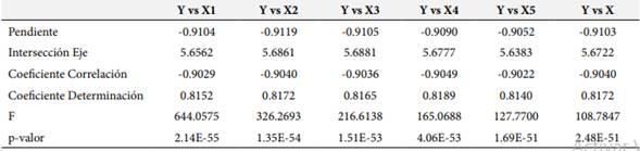 A fin de corroborar las hipótesis de trabajo planteadas, se desarrollan seis modelos de regresión lineal, uno por cada hipótesis, para luego efectuar un análisis de varianza y determinar si el modelo (y el coeficiente de correlación calculado) es significativo; el resumen de los parámetros del modelo y de la prueba de hipótesis se muestran en la Tabla 3, mientras que la Figura 3 muestra la representación gráfica de los modelos desarrollados. Para todos los casos, se verifica que el coeficiente de correlación (y la pendiente del modelo) es negativo, con valores que oscilan entre -0.9049 (Y vs X4) y -0.9022 (Y vs X5), lo cual significa que la relación entre los factores es negativa (a medida que una de las variables aumenta o disminuye, la otra responde en la dirección contraria). Este hallazgo concuerda con lo que se observa en los diagramas de dispersión, donde la recta de tendencia es descendiente (pendiente negativa) y con poca distancia entre los puntos y la recta, lo cual indica que el ajuste es bueno.