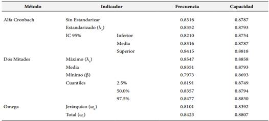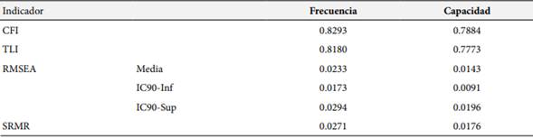 Para verificar la confiabilidad de los dos modelos, se utilizaron los modelos de Alfa de Cronbach, el modelo de las dos mitades y omega, los resultados se muestran en la Tabla 5. Verificando los valores de Alfa de Cronbach, los valores del coeficiente estandarizado para las variables Frecuencia y Capacidad son 0.8352 y 0.8793, respectivamente; los intervalos de confianza al 95% están dentro del rango considerado como aceptable. A través del método de las dos mitades, se reportan valores de 0.8351 para Frecuencia y 0.8793 para Capacidad, valores muy similares a los obtenidos con el Alfa de Cronbach; todos los valores están dentro del rango de los considerado como aceptable. Analizando el valor del coeficiente omega, se reporta que el modelo es capaz de explicar el 84.23% de la variabilidad de la Frecuencia y el 88.07% de la Capacidad; adicionalmente, al análisis de la omega jerárquica revela que el 96.17% de la variabilidad de la Frecuencia y el 95.29% de la variabilidad de la Capacidad son atribuibles al factor general de cada modelo.