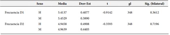 Para determinar si el sexo es un factor capaz de condicionar el puntaje, se desarrolla una prueba t de diferencia de medias, cuyos resultados se reportan en la Tabla 11. Para todos los factores analizados, se reporta que p>0.05, es decir, no se encontraron diferencias significativas entre sexos para los puntajes de las variables y dimensiones del estudio.