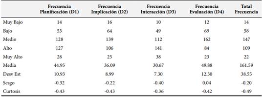 La Tabla 1 muestra el estadístico de la variable frecuencia de autoeficacia y sus dimensiones. En todos los factores se observa un patrón creciente, siendo en todos los casos la categoría Muy Alto la modal, con frecuencias que van desde 165 (D2 - Implicación) hasta 307 (D1 - Planificación) casos. El menor promedio registrado es 39.88 (de un máximo posible de 48 puntos) y corresponde a la dimensión Interacción, mientras que el máximo promedio tiene un valor de 68.43 (de un máximo posible de 84 puntos) y corresponde a la dimensión Evaluación. La menor desviación estándar tiene un valor de 4.34 y corresponde a la dimensión Interacción, mientras que la máxima dispersión es de 5.70 y corresponde a la dimensión Evaluación.