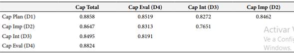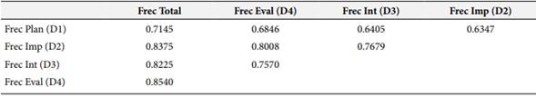 Las Tablas 3 y 4 reportan las correlaciones para las dimensiones de la variable Frecuencia y Capacidad, respectivamente. Para todos los casos, las correlaciones reportadas son significativas (p<0.05); para la variable Frecuencia, el menor valor reportado es de 0.6347 y corresponde a la correlación entre D1 y D2, mientras que el mayor valor es de 0.8540 y representa la relación entre la variable Frecuencia y la dimensión Evaluación (D4). En el caso de la variable Capacidad, el menor grado de ajuste tiene un valor de 0.7651 y representa la relación entre las dimensiones Interacción (D3) e Implicación (D2); por otra parte, el mayor valor reportado es de 0.8858 y corresponde a la relación entre la variable Capacidad y la dimensión Planificación (D1).