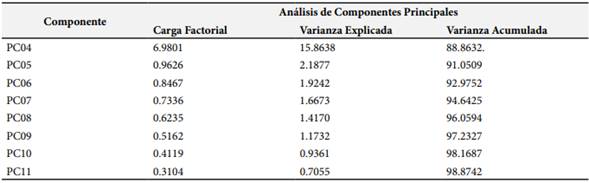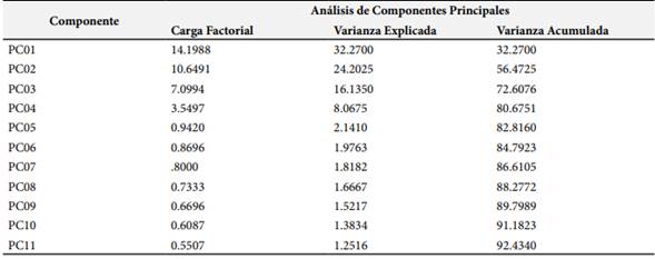 El análisis de componentes principales (PCA) permitió identificar las dimensiones subyacentes del instrumento, optimizando su interpretación mediante la rotación ortogonal Varimax. Esta técnica evidenció que las dimensiones planteadas reflejan fielmente la estructura teórica del constructo, lo que refuerza la validez de la escala.