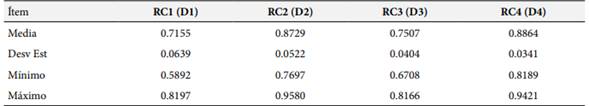 El resultado de la rotación ortogonal usando el método varimax se muestran en las Tablas 8 (Frecuencia) y 9 (Capacidad). Para ambas variables, cada una de las cuatro dimensiones del modelo original coinciden con los 4 componentes del modelo desarrollado. Para el caso de la variable Frecuencia, los coeficientes del modelo oscilan entre 0.7155 (D1) y 0.8864 (D4), mientras que para capacidad el rango va desde 0.6312 (D3) hasta 0.7894 (D4).