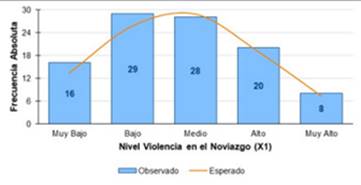 La distribución de frecuencias de la variable Violencia en el Noviazgo (X1) se reporta en la Figura 1. Se observa que la categoría Bajo (aquellos casos con un promedio global entre 0.8 y 1.6 puntos) reportan la mayor cantidad de casos, con 28 sujetos; por otra parte, la categoría Muy Alto (3.2 - 4.0 puntos de promedio) son los casos menos frecuentes, con 8 sujetos dentro de dicho rango.
