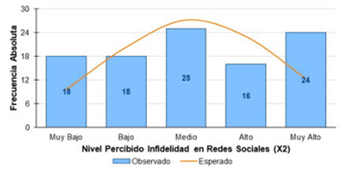 La distribución de frecuencias de la variable Infidelidad en Redes Sociales (X2) se reporta en la Figura 2. La variable analizada reporta una media de 6.33 y una desviación estándar de 3.48. El coeficiente de asimetría o sesgo de los datos tiene un valor de 0.08, lo cual significa que los datos están bastante cerca de la condición de simetría, con un ligero predominio de los valores mayores a la media. Por otra parte, la curtosis del conjunto tiene un valor de -1.23, lo cual significa que la geometría de la distribución es más achatada o aplanada (platicúrtica) que la distribución normal. Se observa que la categoría Medio (puntaje total entre 4.8 y 7.2 puntos) es la clase modal, con 25 casos reportados; por otra parte, la categoría Alto (puntaje entre 7.2 y 9.6) es la menos frecuente, con 16 sujetos reportados en esta clase.