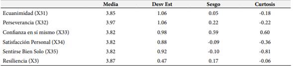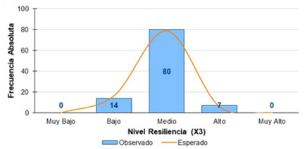 Las principales medidas estadísticas para la variable Resiliencia (X3) y sus dimensiones se encuentran en la Tabla 7. El mayor promedio del conjunto analizado corresponde a la dimensión Perseverancia (X32) y tiene un valor de 3.97, mientras que el menor valor es de 3.82 y corresponden a las dimensiones Confianza en sí mismo (X33), Satisfacción Personal (X34) y Sentirse Bien Solo (X35). La distribución de frecuencias para la variable Resiliencia (X3) se reporta en la Figura 3. Se observa que la categoría Medio (puntaje promedio entre 3.4 y 4.6) es la más frecuente, con 80 casos reportados; por otra parte, la categoría Alto (puntaje promedio entre 4.6 y 5.8) reporta 7 casos, lo cual la hace la menos frecuente.